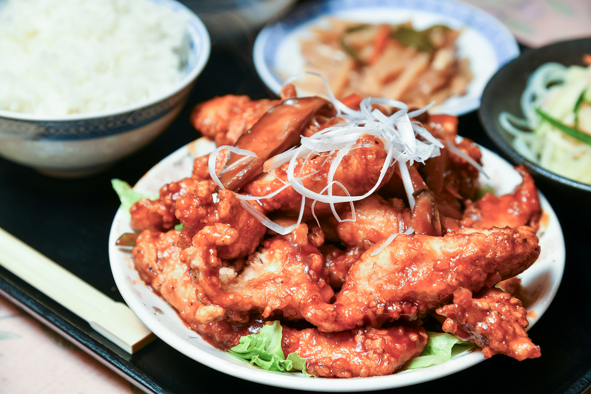 ランチの定食は、「唐揚げ」「魚の甘酢」「鶏むね肉の甘酢」の3種類。甘酢餡は、店主が幼い頃に味わった記憶をもとにアレンジしたもの。ケチャップと酢をベースにした餡に、シイタケ、ピーマン、玉ねぎなど炒めた野菜を合わせている。「鶏むね肉の甘酢」は、唐揚げを餡に絡めた一品。鶏むね肉はしっとりと柔らかく、たっぷりの餡で白飯との相性も最高。野菜はシャキッと瑞々しく、食感のコントラストも楽しい。