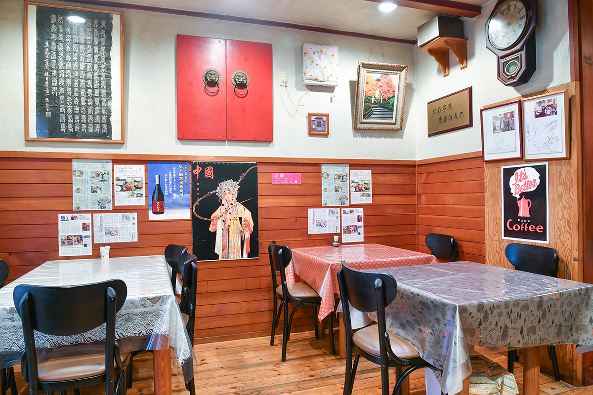 店主はこの店を始める直前に、中国への留学を経験。店内の装飾には、そこで求めたり、作ったりしたものも。「君若満意請告訴朋友」の看板は、デザインなどを指示して中国の学生に作ってもらったオリジナル。対になる看板もあるので、気になる方は訪ねてみて。藤田嗣治をはじめ有名無名を問わず、店主が集めた絵もたくさん飾られていて、店内を見渡せば、店主のあふれる才能と趣味の深さも垣間見える。