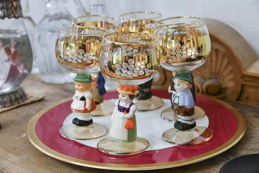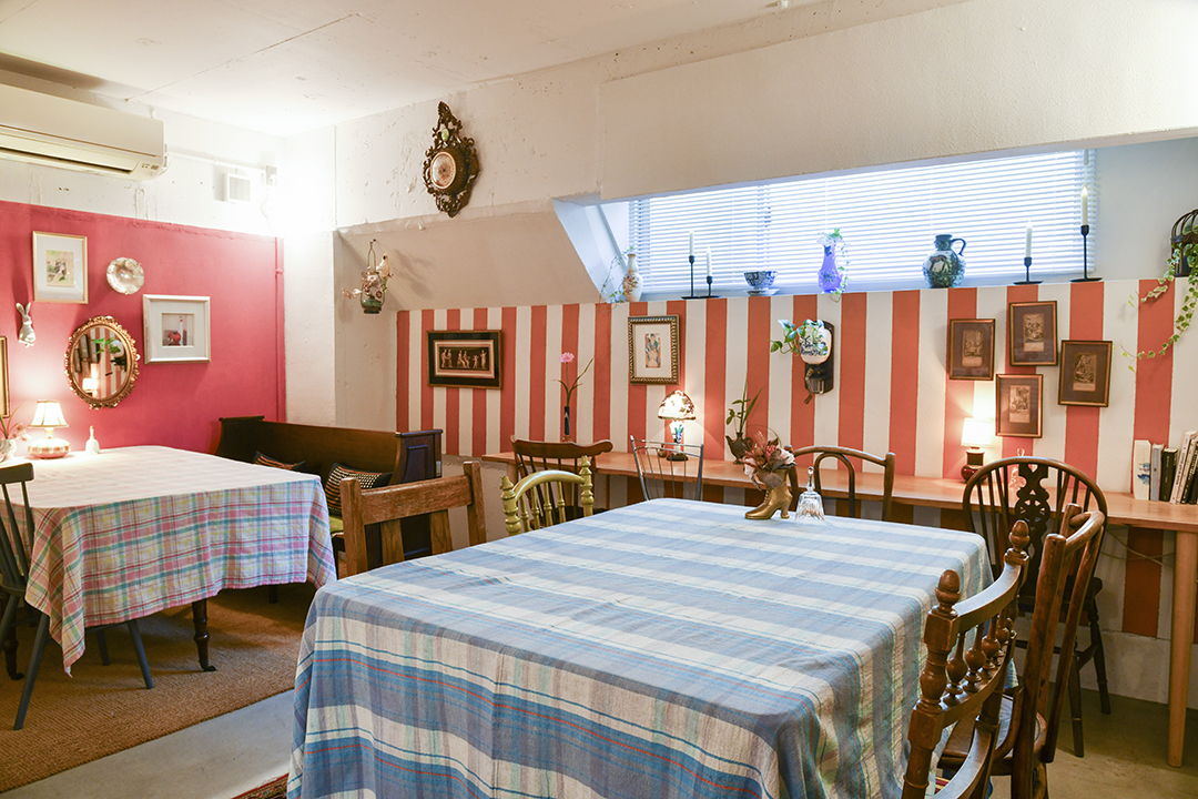 国内外のアンティークやヴィンテージに囲まれ、緑や花々がセンスよく配された店内。春日杉のカウンターテーブルや、スペースごとに異なる色の壁は、スタッフの手で時間をかけて丁寧に仕上げたとか。手仕事のぬくもりが感じられる落ち着いた空間に、個性豊かなアンティークがさりげなく溶け込み、訪れる人を惹きつけている。