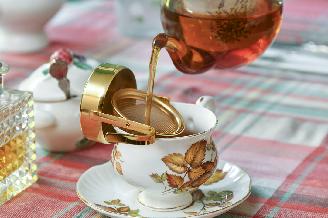 この日に選んだドリンクは、ポットで提供される紅茶。アップルブランデーのカルヴァドスが添えられ、数滴垂らすとアールグレイの澄んだ香りに、カルヴァドスの芳醇な余韻がふわりと重なる。ほっと安らぐ香りの紅茶に華を添える、美しいカップ&ソーサーにも注目を。目にも楽しく、上質なひとときを満喫したい。