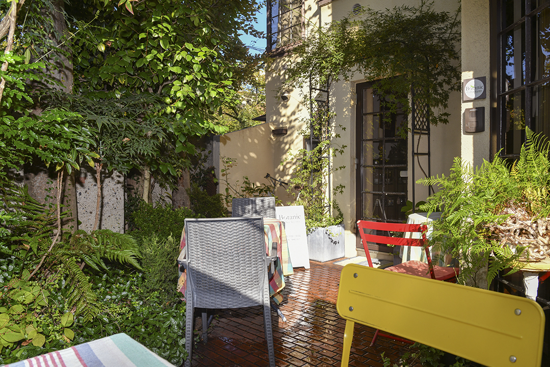 カフェの入口は地下1階。地上から外階段を降りると、緑鮮やかな草木に包まれたクラシカルなテラスが現れる。テーブルクロスや椅子、煉瓦の風合いが、しみじみと素敵。思わず足を止め、ゆったり眺めてしまいそう。
