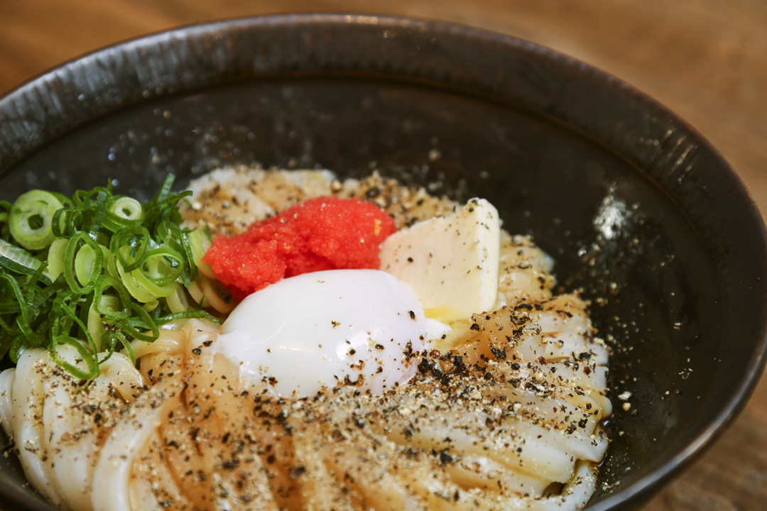 注目のうどんは、讃岐の製法をベースにしつつ、出汁は関西風というハイブリッド型。かけうどんや生醤油うどんなど、うどんのおいしさをダイレクトに味わえる定番シンプルメニューのほか、「バター、ブラックペッパーと温泉卵と明太子生醬油」も開店以来の人気のひと品。