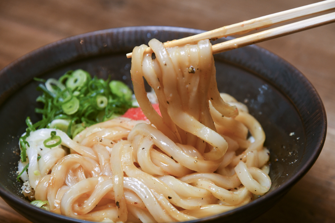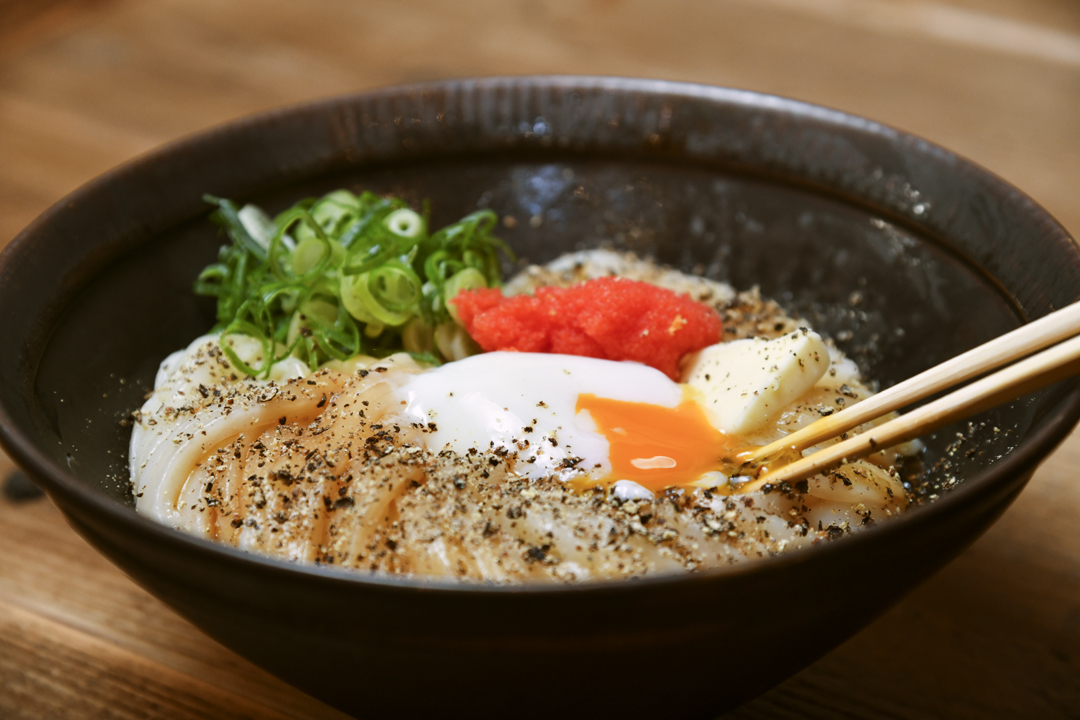 手打ちしたうどんの上に、温泉卵とネギ、明太子、バターをトッピング。さらに四国の海沿いで愛される甘い醤油をたらりと回しかけ、ブラックペッパーをガリガリガリとた~っぷり挽いてサーブする。温泉卵を箸で割り、少しずつ溶けていくバターと混ぜて啜れば、明太子とブラックペッパーの刺激がマイルドに。明太子やネギの風味、バターのコク、温泉卵のまろやかな味わい、生醤油の香りが渾然一体になってうどんに絡まり、啜るほどにハマっていく。
