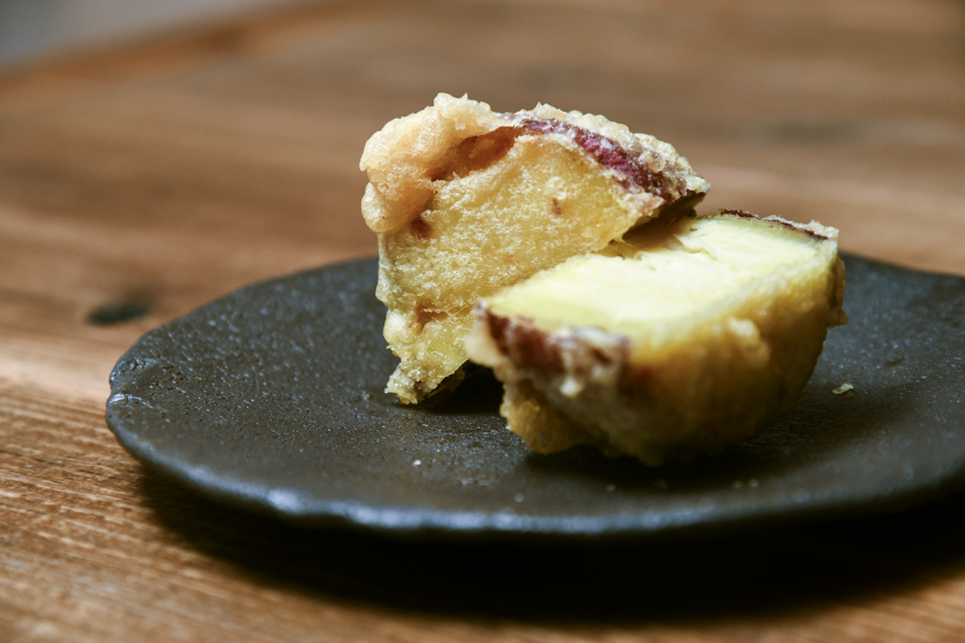 海老やかしわ、半熟卵、季節の野菜といった天ぷらも必食。今の時期におすすめの「蒸し甘芋天」は、紅はるかや安納芋などのねっとりとした食感のさつまいもを一度蒸してから揚げる。蒸す工程を経ることでホックリとしたおいしさも加わり、より甘さが増すのだとか。サクサクの衣を纏った実りの秋を堪能できる逸品。