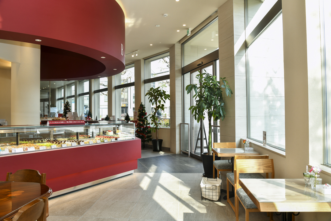 自然光が入る開放的で穏やかな雰囲気の店内。真ん中には赤色を配したショーケースが目を引く