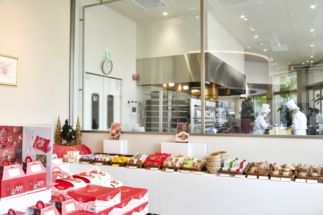 大きなガラス窓越しに工房の様子が間近に見られる。タイミングが合えば、アップルパイが作られているところに出会えるかも