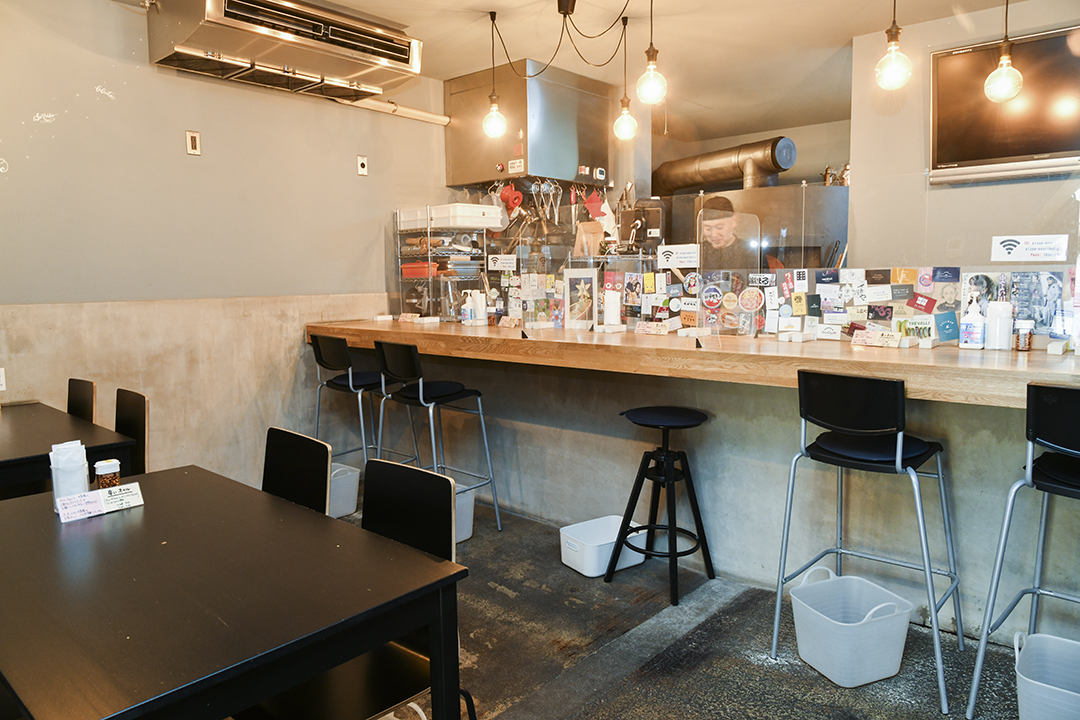 薪窯が見渡せるカウンター席と、落ち着いた黒い木目のテーブル席