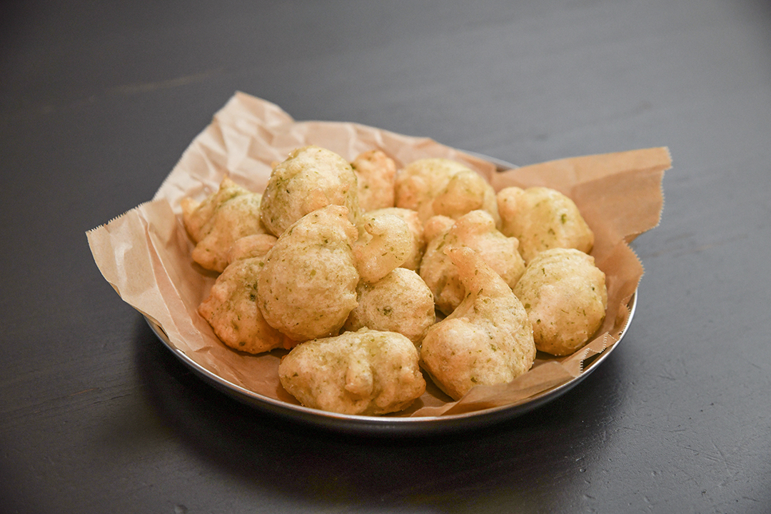 ピッツァと一緒に楽しみたいアラカルトは、一口サイズのおつまみ「ゼッポリーネ」がおすすめ。ふわもちの弾力ある食感が、子ども連れにも好まれるそう。通常より水分量が多いピッツァ生地に、あおさを練り込み、軽やかに揚げて仕上げている。磯の豊かな香りと、ビールやワインが進む絶妙な塩味で、満腹でもつい手が伸びてしまう。