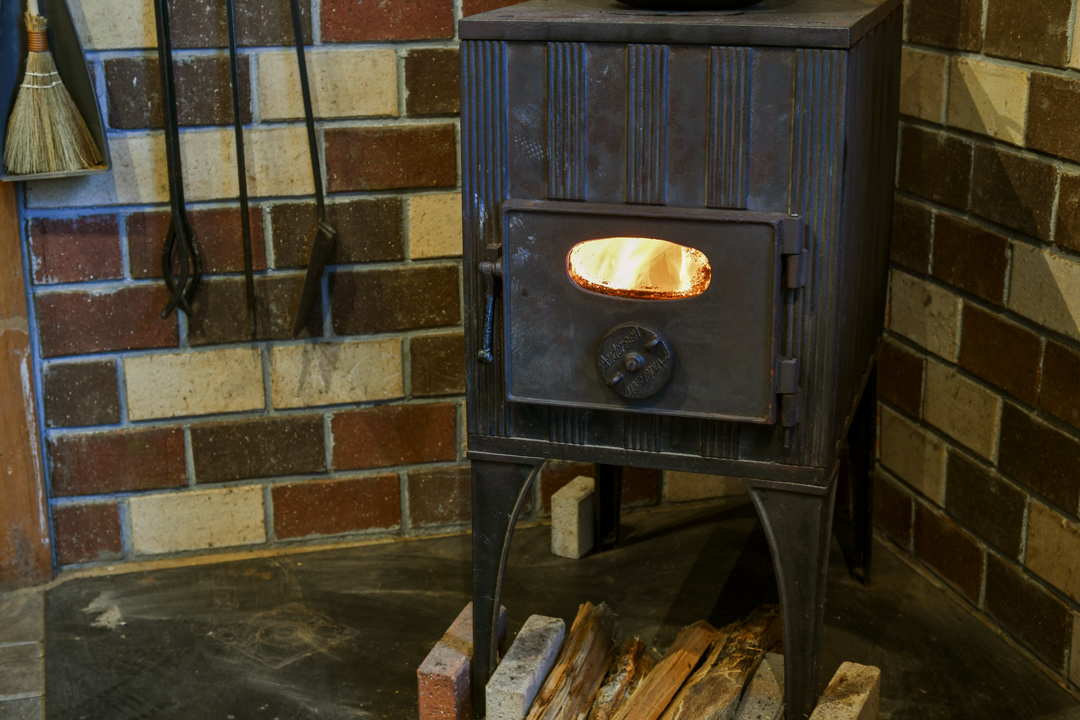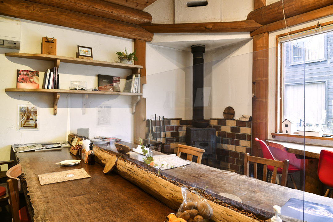 薪ストーブで店内はあったか。「ワンちゃんOK」のテラス席も