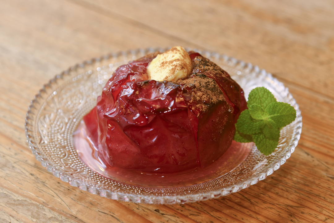 2025年11月から、ピザ窯で焼く「とろとろ窯焼きりんご」がメニューに加わった。使用するりんごは時期によって変わるものの、通年で楽しめる。取材時のりんごは、ルビーのような鮮やかな色と爽やかな甘酸っぱさが魅力の紅玉。表面の砂糖が窯焼きすることでパリッとしたアメ状になり、とろとろに仕上がった中身との食感のコントラストがおいしい。