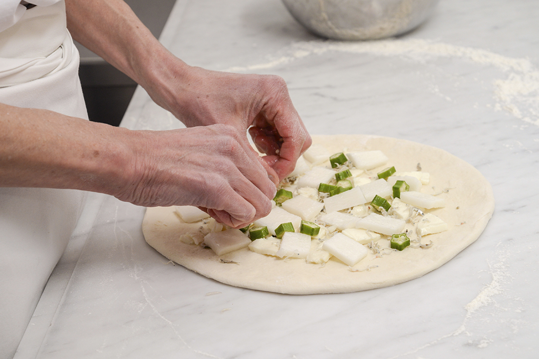 オクラと山芋が絶妙にマッチ。特製醤油の「おくらやまピッツァ」