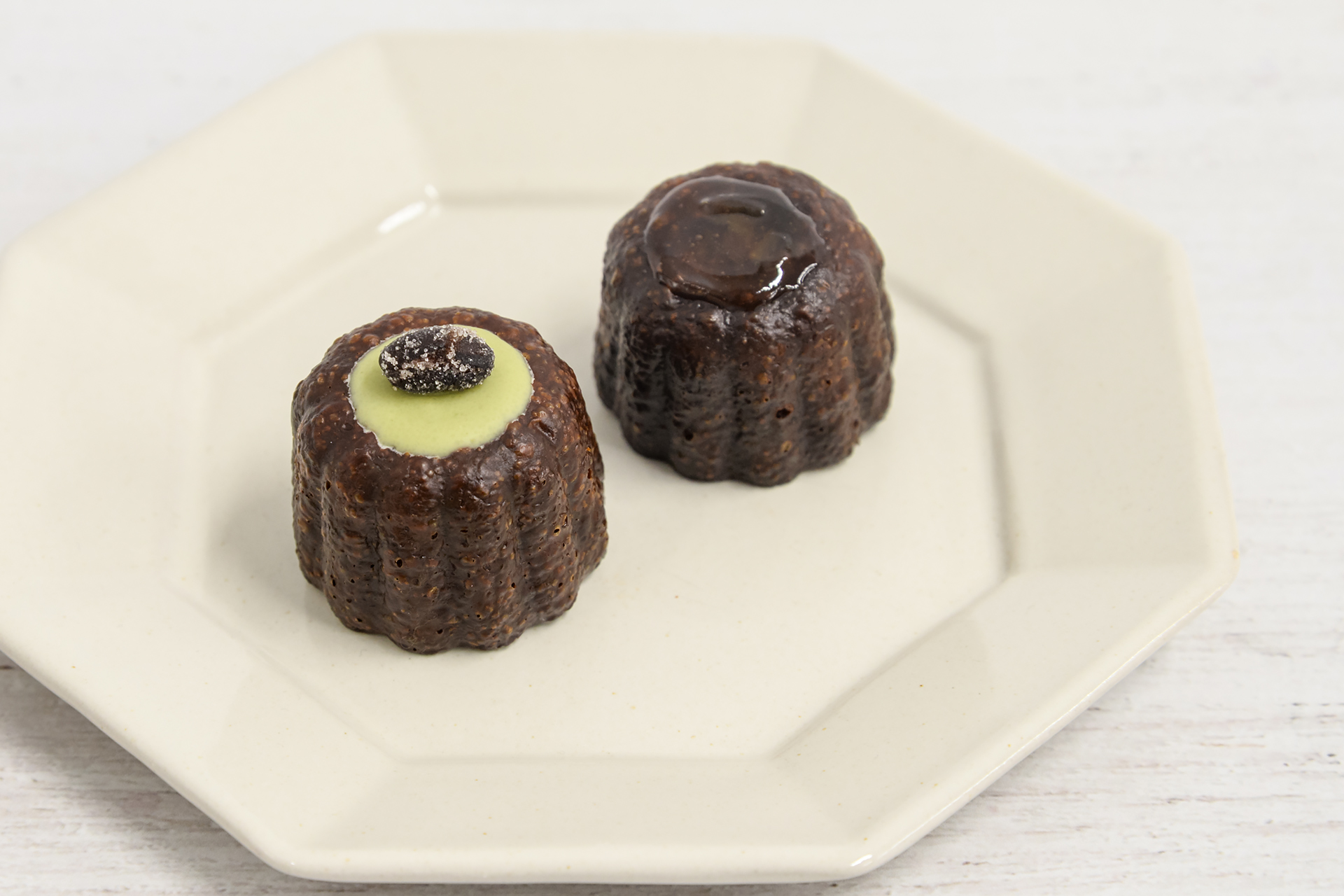 カヌレのスモールサイズ。(左から)濃厚抹茶(350円)、柚子(360円)※すべて税別
