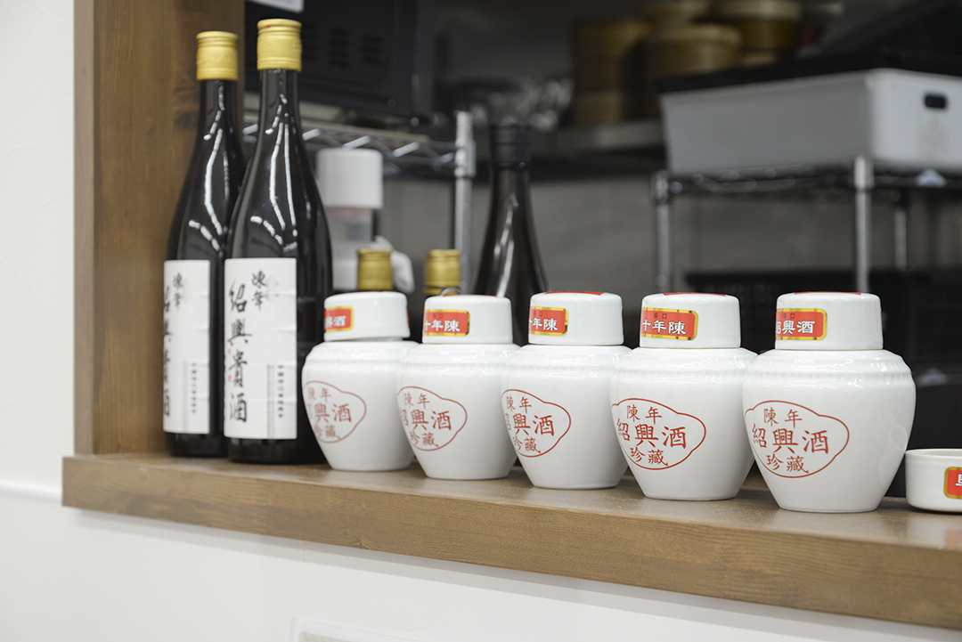 キッチンを望むカウンター上に置かれた紹興酒