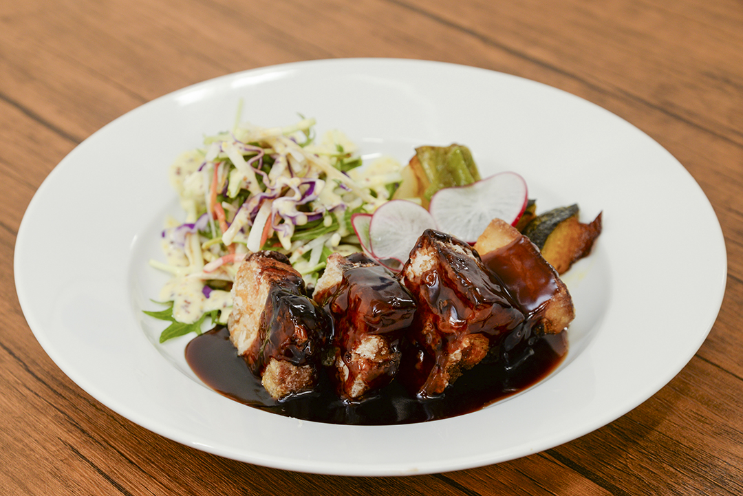 洋食のエッセンスが感じられる盛り付け。旬の焼き野菜とサラダを添えた「2種ベリーの黒酢豚」1,500円