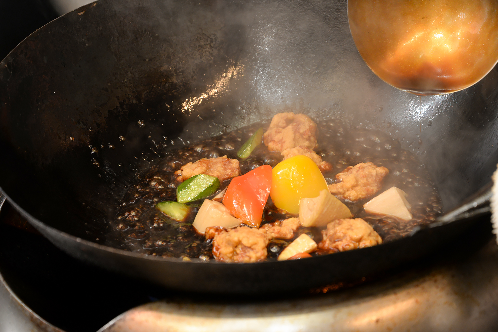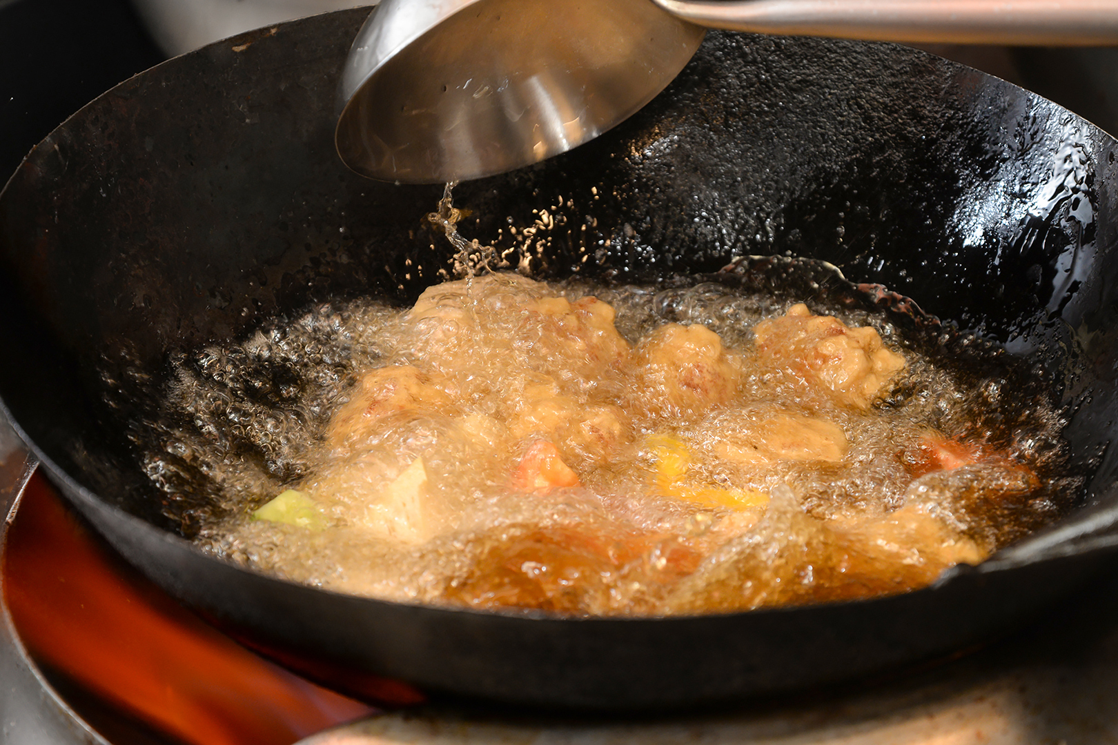 新鮮な油で高温調理。酢豚にはゴマ油を加え、香ばしさを引き立てる