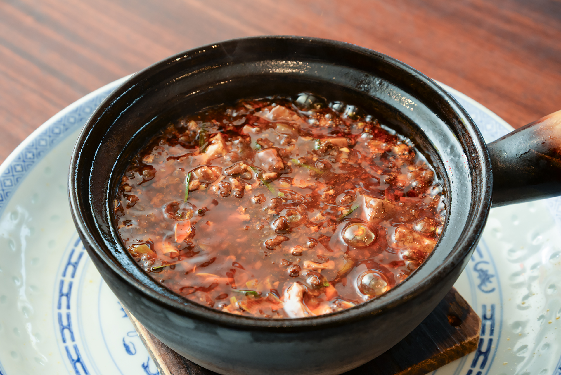 自家製ラー油がいつまでも冷めず、辛さをより増幅させる。ハフハフと言いながら刺激と旨みを堪能し、アツアツの餡が口からのど、胃へと移りゆく。全身で味わえる一皿。小辛、普辛、中辛、激辛の4段階あり、土鍋で提供されるのは普辛以上。辛さが苦手な方は小辛がおすすめ。