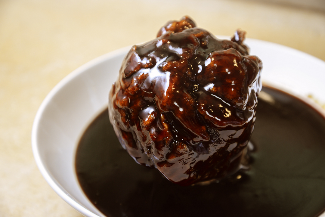 直径10センチ弱もある球体は、「古老豚(具だくさんの酢豚)」にも使われている豚肩ロースを片栗粉でひとまとめにして、じっくりカラリと揚げたもの。中国・上海の北に隣接する江蘇省鎮江市名産の黒酢を使ったタレをまとったその姿は、まさに「肉球」。フォークとスプーンで真ん中から割って食べると、外側はカリッと、中はむっちりとしてジューシーな仕上がり。芳醇な香りとまろやかな酸味、深いコクが特徴の黒酢の風味がくせになる、ほかのどこにもない酢豚。下に敷かれた長芋の素揚げのシャキシャキ&ほっくりとした食感も箸休めにちょうど良い。