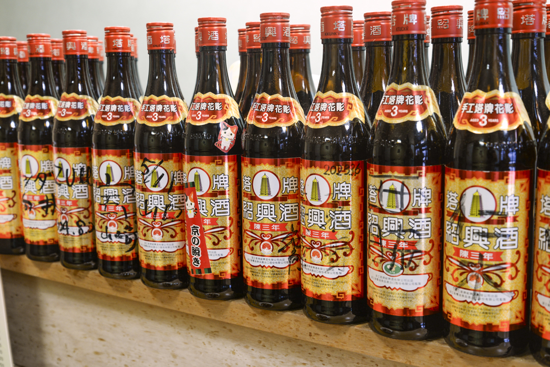 カウンターの上には、常連客がボトルキープした紹興酒がずらり