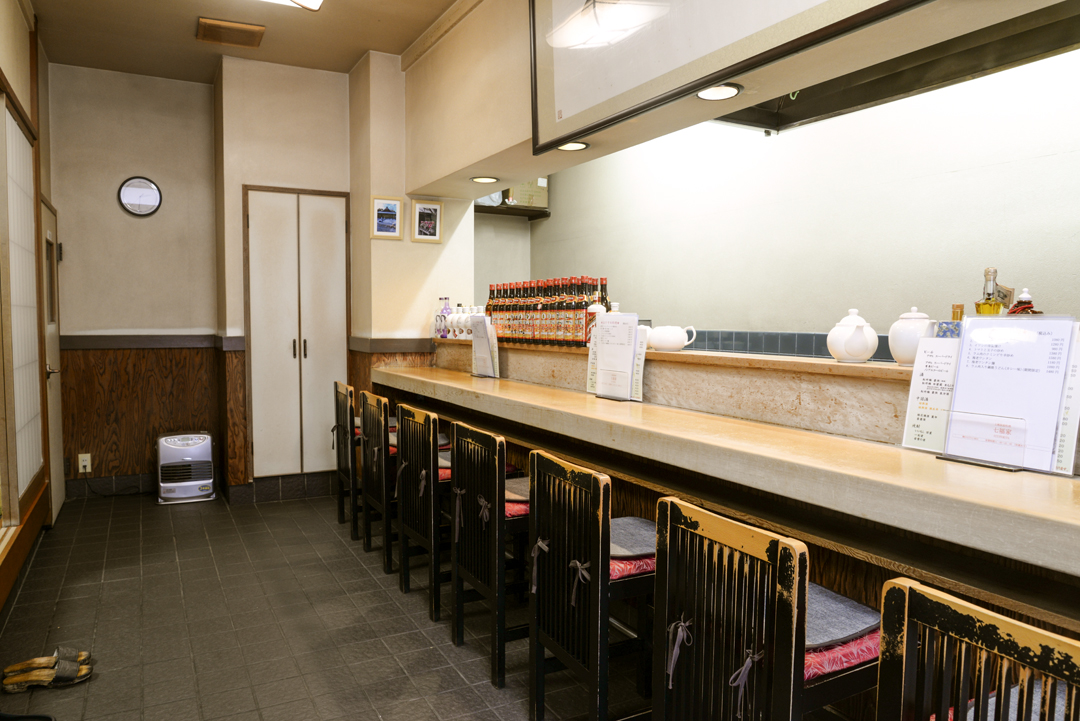 本格中華料理の店ながら、昼も夜も一人でも気軽に入れるところが嬉しいこちら。カウンターで料理一品と一緒に紹興酒を飲む一人客もいれば、座敷席では地元の保護者会の宴会が催されていることも。