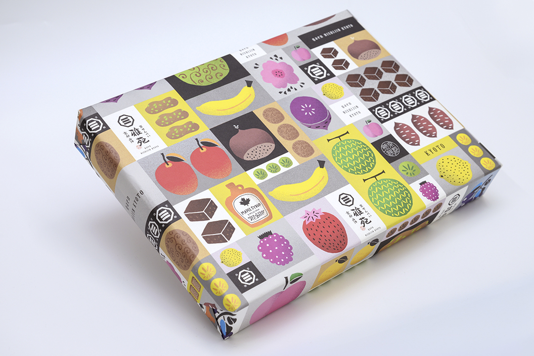 バターを使わず、甘みがすっと引く味わいで、毎日のおやつにぴったり。砂糖がなじむように一晩寝かせた生地を、水分量を調整しながら、職人の感覚で香ばしく焼き上げている。「iroiro菓 ~みやび~」の包装紙は、フルーツの可愛らしいイラストや店のロゴを散りばめたデザイン。温かみのあるユニークな包装紙に、ブックカバーとして再利用する人もいるそう。