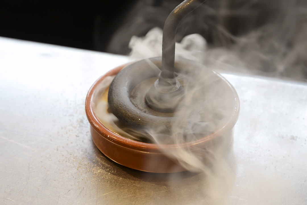 キャラメリゼに使うのは、直火で熱したコテ。カウンター越しにキッチン奥で仕上げる様子が見え、じゅわっという音とともに、もくもくと上がる煙には思わず目を見張る。
