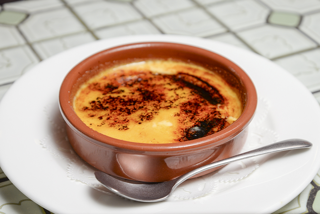 本場のレシピで作るクレマカタラーナは、食感のコントラストが絶妙。キャラメリゼしたグラニュー糖の下に、冷たいカスタードが控える。スプーンを入れると表面が静かに崩れ、あふれ出すのはなめらかなカスタード。口の中でシャリシャリのグラニュー糖と、とろみのあるカスタードが溶け合って、食感の違いが心地よい。