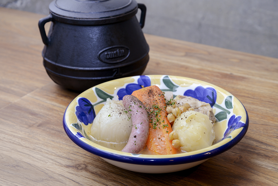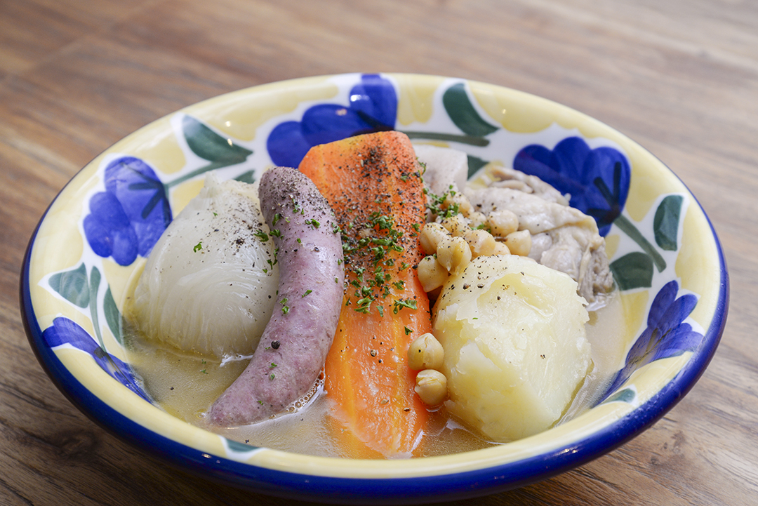 看板メニューは、体が温まるコシード。スペインの広い地域で親しまれているコシードは、肉や野菜を塩でコトコト煮込み、特別な日に大人数で囲む郷土料理。こちらでは「素材を余すことなくシンプルに味わう、スペインの文化を伝えたい」との思いで、数年前から登場した。鶏肉と豚肉のブイヨンを使ったスープは、具材のエキスが溶け込み、コク深くまろやか。ジューシーな肉は旨みが際立ち、ほくほくの野菜は自然な甘みをしっかりと味わえる。素朴な見た目ながらも、一口ごとにしみじみと満足できる一品。