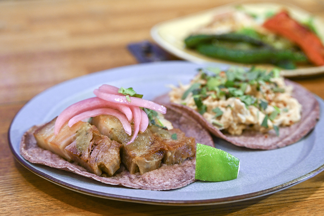 ほろほろの豚バラ肉を、自家製サルサで軽やかに味わうカルニータス。柔らかいトルティーヤに、ラードでじっくりと煮込んだ厚切りの豚バラ肉をのせ、ヴェルデサルサ、刻みパクチー、紫玉ねぎのピクルスを添えて仕上げる。