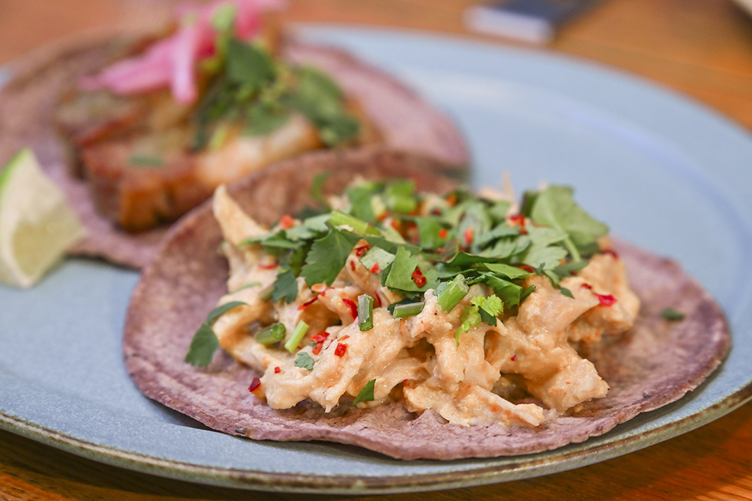 この日選んだのは、本場メキシコで親しまれているカルニータス(写真手前)と、オープン当初から続くオリジナルのココナッツチリチキン(写真奥)。カルニータスは辛さ控えめで、タコス初心者にも食べやすく、ココナッツチリチキンは女性客からの支持が高い。