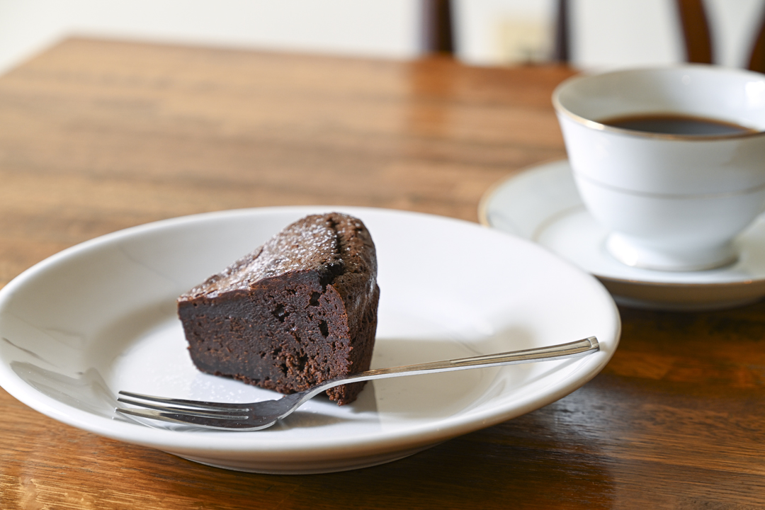 自家製のケーキは、チーズケーキとガトーショコラの二種類。特にガトーショコラは、ビターな深煎り珈琲との組み合わせが最高。ココアたっぷり。乳脂肪分は控えめなレシピでカッチリと焼き上げられたガトーショコラを、少しずつフォークで切り崩して食べるコーヒータイムは至福のひととき。
