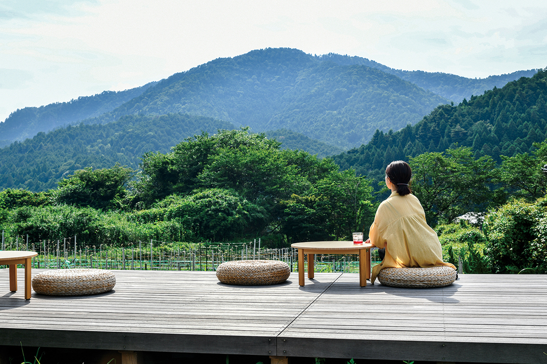 三千院へと続く道から外れ、案内板に誘われて小路をたどると、丘の上に建物が見えてくる。そのわくわく感も楽しみたい。青い空の下、なだらかな山かげが連なった景色は、眺めているだけで朗らかな気分に。建物は、元はしば漬けをつけておく貯蔵庫だったもの。店内のほか、庇の下の屋外席、靴を脱いでくつろぎながら眺めを楽しめるテラス席がある。景色、空気、香り、味わい。気取らない大原の良さを全身で感じられる。予約はインスタグラムから可能(BASEからは不可)。