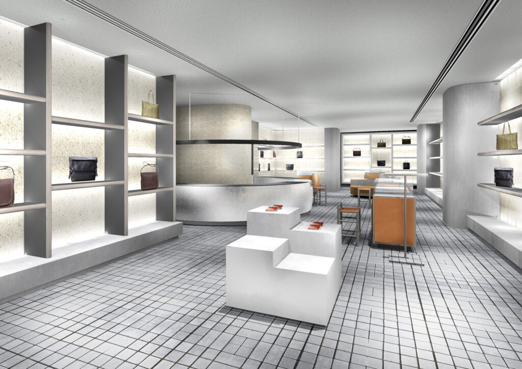 新店舗は、ものづくりの文化が根付く京都から、土屋鞄が続けてきた職人の手仕事を広めていきたいとの想いを込め、それらを体現した空間となっています。中央には現存する日本で最も古い京都の錫工房「清課堂」が手掛ける錫製のカウンターを設置。清課堂独自の装飾技法を用い、カウンター前面にやわらかく淡い光沢の文様を施しました。接客やお手入れ、修理相談を受ける場としても機能します。さらに店内の什器には土屋鞄製品にも採用されている国産牛革のヌメ革を取り入れ、店舗の歩みと共に革の経年変化を楽しめる空間となっています。
